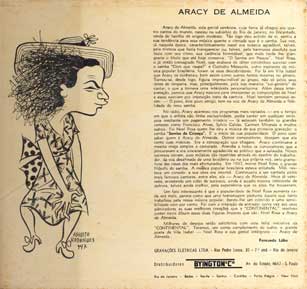 Aracy de Almeida, esta genial sambista, cuja fama já chegou aos quatro cantos do mundo, nasceu no subúrbio do Rio de Janeiro, no Encantado, vinda de família de origem modesta. Tão logo deu acordo de si, sentiu a sua tendência para essa música quente e ritmada que é o samba. Sua voz, já naquela época caracteristicamente nasal, era todavia agradável, talvez, pela tristeza que fazia transparecer ou, talvez, pela harmonia absoluta que fazia com seu ritmo, sua cadência formidável, que mais tarde lhe granjearia o título que até hoje conserva: O Samba em Pessoa. Noel Rosa, o já tão consagrado Noel, que acabava de obter estrondoso sucesso com o samba Com que Roupa?, e Custodio Mesquita, outro expoente da música popular brasileira, foram os seus descobridores. Foi lá em Vila Isabel que Aracy os conheceu, bem assim como outros tantos mestres do gênero. Tornou-se, desde logo, figura imprescindível ao grupo, não só pelos seus dotes de simpatia, mas, principalmente pela sua maneira sui generis de cantar, o que a tornava uma intérprete personalíssima. Além dessa interpretação, parecia que Aracy nascera para interpretar as composições de Noel e essas nasciam por imposição inata da cantora. Noel também pensava assim: O povo, este povo amigo, tem na voz de Aracy de Almeida a fidelidade do meu samba.
