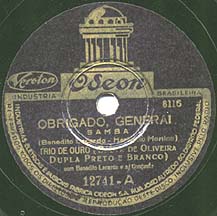 Odeon 12661-A in January 1946.The plea of Obrigado, Excelência! was answered, and the following year Obrigado, General warmly thanked Gaspar Dutra for resurrecting Praça Onze, i.e., allowing the samba to continue there. Given that the samba schools always strove for the legitimacy conferred by a parade in the main avenues, the motive for Obrigado, General appears flimsy at best.