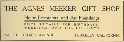 Advertisement in the University of California Blue & Gold, 1910Mrs. Kluegel was an art and nature lover. For a number of years, she was an officer of the Agnes Meeker Gift Shop, Inc., an establishment purveying art goods at 2310 Telegraph Avenue, near the corner of Bancroft Way. The shops advertisement in the 1910 Blue & Gold described the business as House Decorators and Art Furnishings, offering gifts suitable for birthdays, weddings, and the holidays. Agnes Meeker was president of the business, and Mrs. Kluegel was listed as [corporate] secretary. According to the 1910 census record, she was the proprietor at the time.