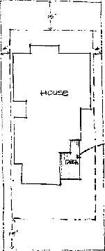 This time she provided the drawing below. The hatched area on the west side is the location of the kitchen (ground floor) and laundry room (second floor). The dining room is located directly to the east. Drawing proportions are inaccurate.