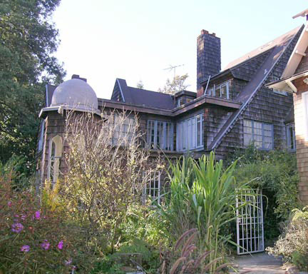 Le Conte Avenue as seen from the roof of Kingman Hall. The arrow points to the Kluegel House. To the right are the Bentley House (A.H. Broad, 1900) and the Hatfield House (Julia Morgan, 1908).