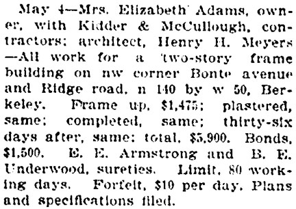 May 4Mrs. Elizabeth Adams, owner, with Kidder & McCullough, contractors; architect, Henry H. MeyersAll work for a two-story frame building on nw corner Bonte avenue and Ridge road, n 140 by w 50, Berkeley. Frame up, $1,475; plastered, same; completed, same; thirty-six days after, same: total, $5,900. Bonds, $1,500. E. E. Armstrong and B. E. Underwood, sureties. Limit, 80 working days. Forfeit, $10 per day. Plans and specifications filed.