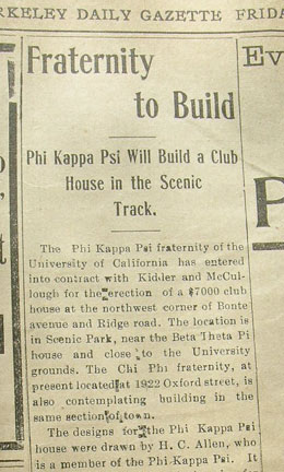 The Phi Kappa Psi fraternity of the University of California has entered into contract with Kidder & McCullough for the erection of a $7000 club house at the northwest corner of Bonte avenue and Ridge road. The location is in Scenic Park, near the Beta Theta Pi house and close to the University grounds. The Chi Phi fraternity, at present located at 1922 Oxford street, is also contemplating building in the same section of town.