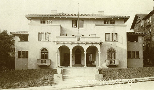 The house was designed by Harris C. Allen in 1915. College Hall (demolished 1938) can be glimpsed on the right.By 1915, the Phi Kappa Psi house could no longer accommodate a growing chapter. Accordingly, a new chapter house was built a block away, at 2625 Hearst Avenue (next to the Beta Theta Pi house). This second house was also designed by Harris Allen. In May 1915, The Architect & Engineer noticed it as a 3-story frame and stucco fraternity for Phi Kappa Psi, costing $15,000. Originally fashioned in the Beaux Arts style, it was later expanded, receiving an Art Deco façade.